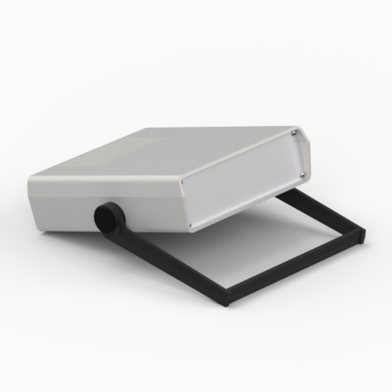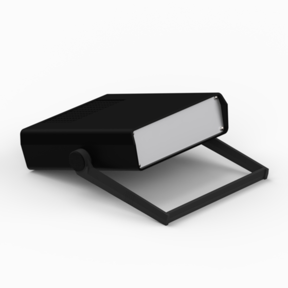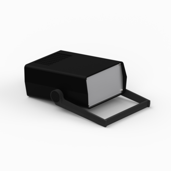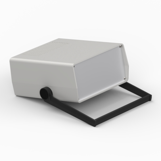 Contenitori in ABS con superfici opache dotati di maniglia con otto diverse inclinazioni e due pannelli frontali in alluminio di spessore 1 mm. I gusci superiori ed inferiori sono dotati di una foratura per aerazione e sono dotati all’interno di punti di fissaggio per PCB. Chiusura a otto viti.