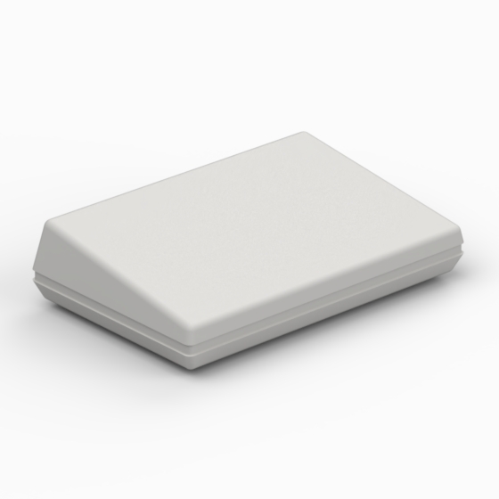 Contenitore in ABS con superfici opache e coperchio inclinato. All’interno sono presenti punti di fissaggio per PCB. Chiusura a quattro viti.