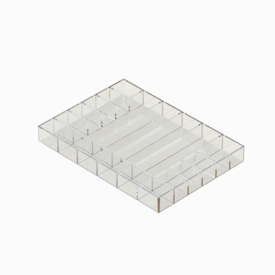 Contenitori in polistirolo con superfici lucide composto da fondo nero e coperchio trasparente. Utile per contenere e selezionare piccoli oggetti. All’interno, a seconda dell’altezza, possono essere utilizzati vassoi con 20, 28 o 36 scomparti (Mod. SCA).