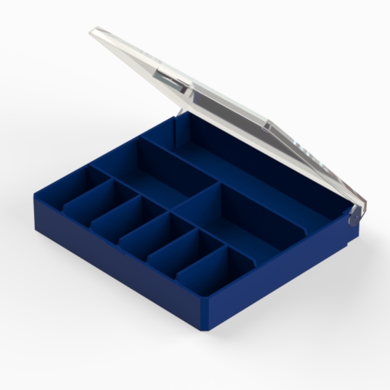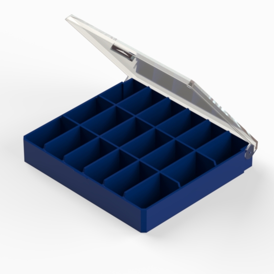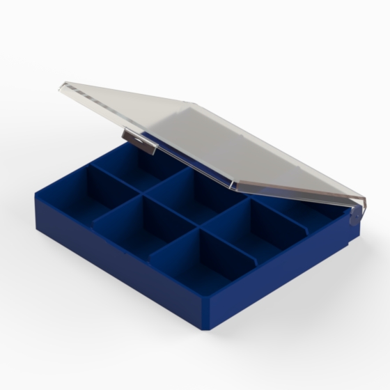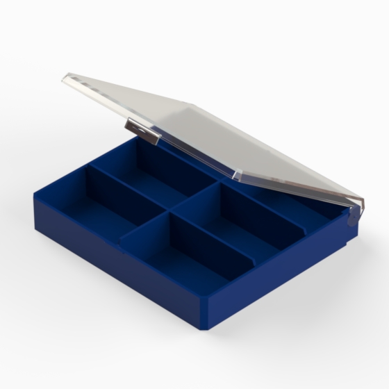 Contenitori in polistirolo con il fondo blu opaco ed il coperchio trasparente lucido. Utile per contenere e selezionare piccoli oggetti. Cinque modelli disponibili.