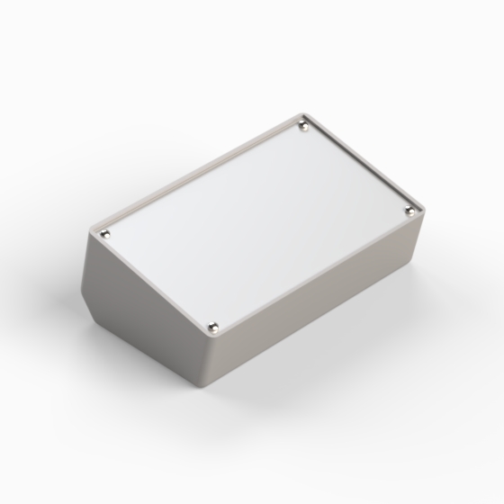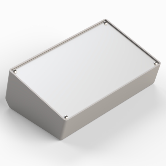 Contenitore in ABS dotato di pannello superiore in alluminio con spessore 1 mm., inclinato di 15°. Pareti con superfici lucide all’interno delle quali sono presenti guide e punti di fissaggio per PCB. Chiusura a 4 viti.