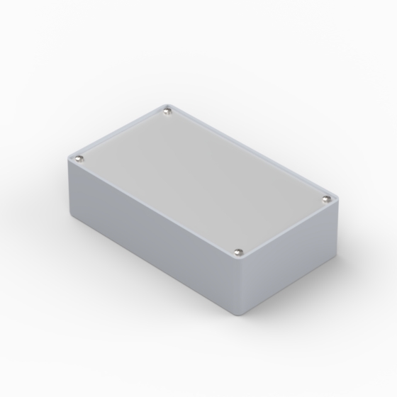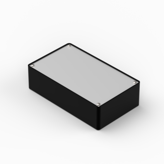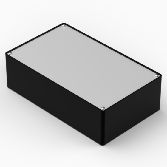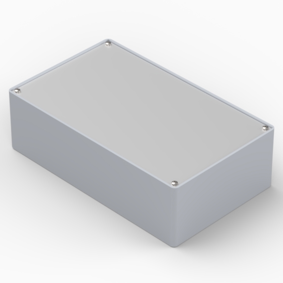 Contenitore in ABS con angoli arrotondati dotato di pannello superiore in alluminio di spessore 1 mm. e con chiusura a 4 viti. Pareti con superfici lucide all’interno delle quali sono presenti delle guide per PCB.